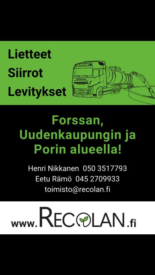 Recolan Oy myy ja toimittaa kotimaisia ja ympäristöystävällisiä kierrätyslannoitteita viljelysmaan parantamiseen Forssasta, Porista ja Uudestakaupungista. Tutustu tästä lietteisiin Lietteiden siirto- ja levityspalvelut maatiloille.Nesteiden ja lietteiden siirtopalvelut teollisuudelle. Tutustu tästä palveluihimme Ota yhteyttä